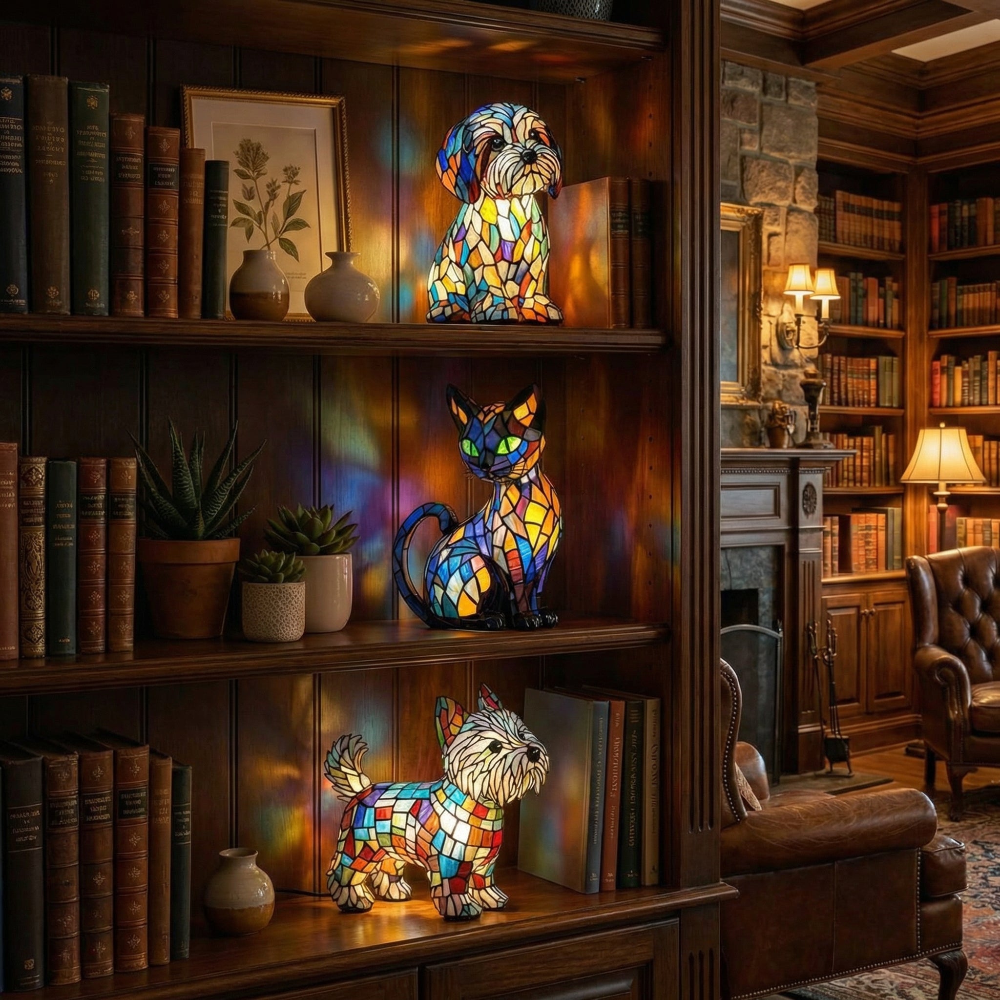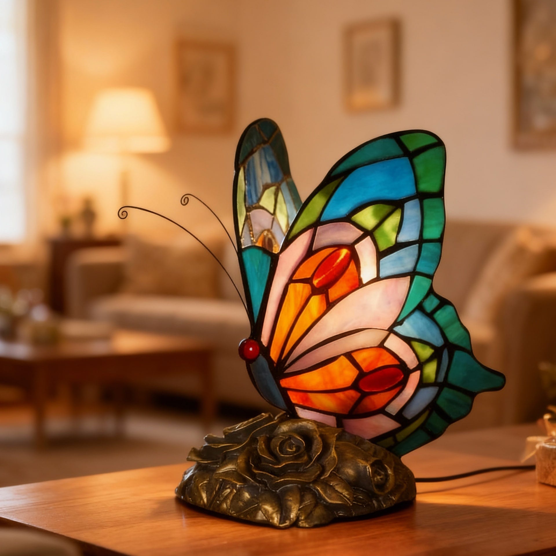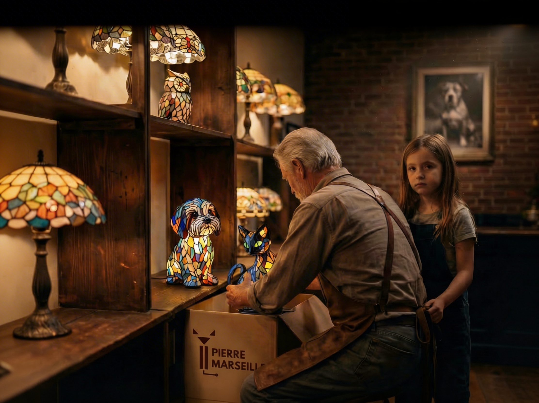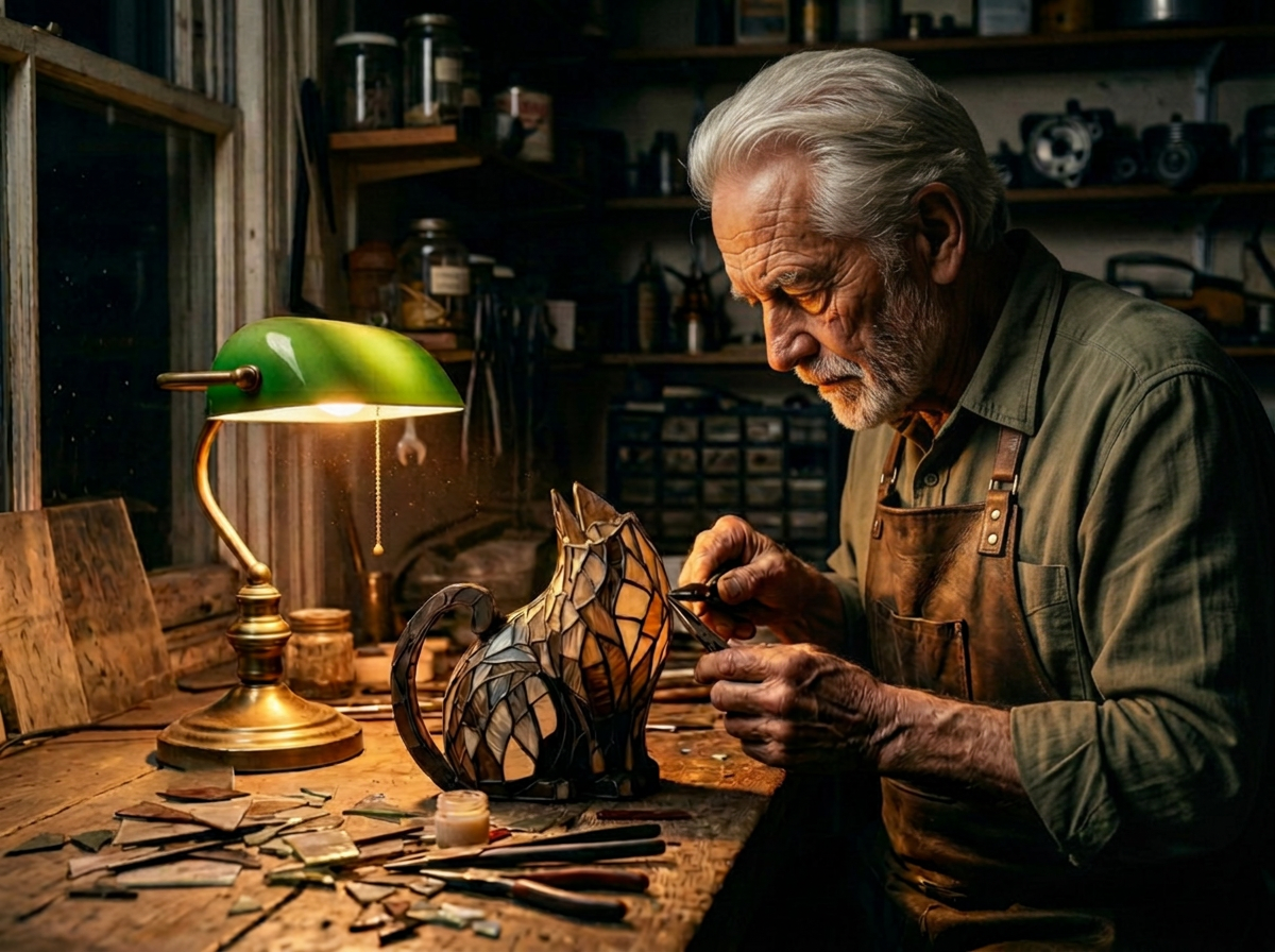 Façonnée à partir de vitraux soigneusement assemblés et modelée par les mains de Pierre lui-même, chaque lampe reflète des décennies de patience, de dévotion et de maîtrise silencieuse. Dans le même petit atelier où sa petite-fille vient maintenant lui passer les bras autour du cou, ces pièces portent une histoire de chaleur, de famille et de charme durable — sans avoir besoin des murs d'une galerie.